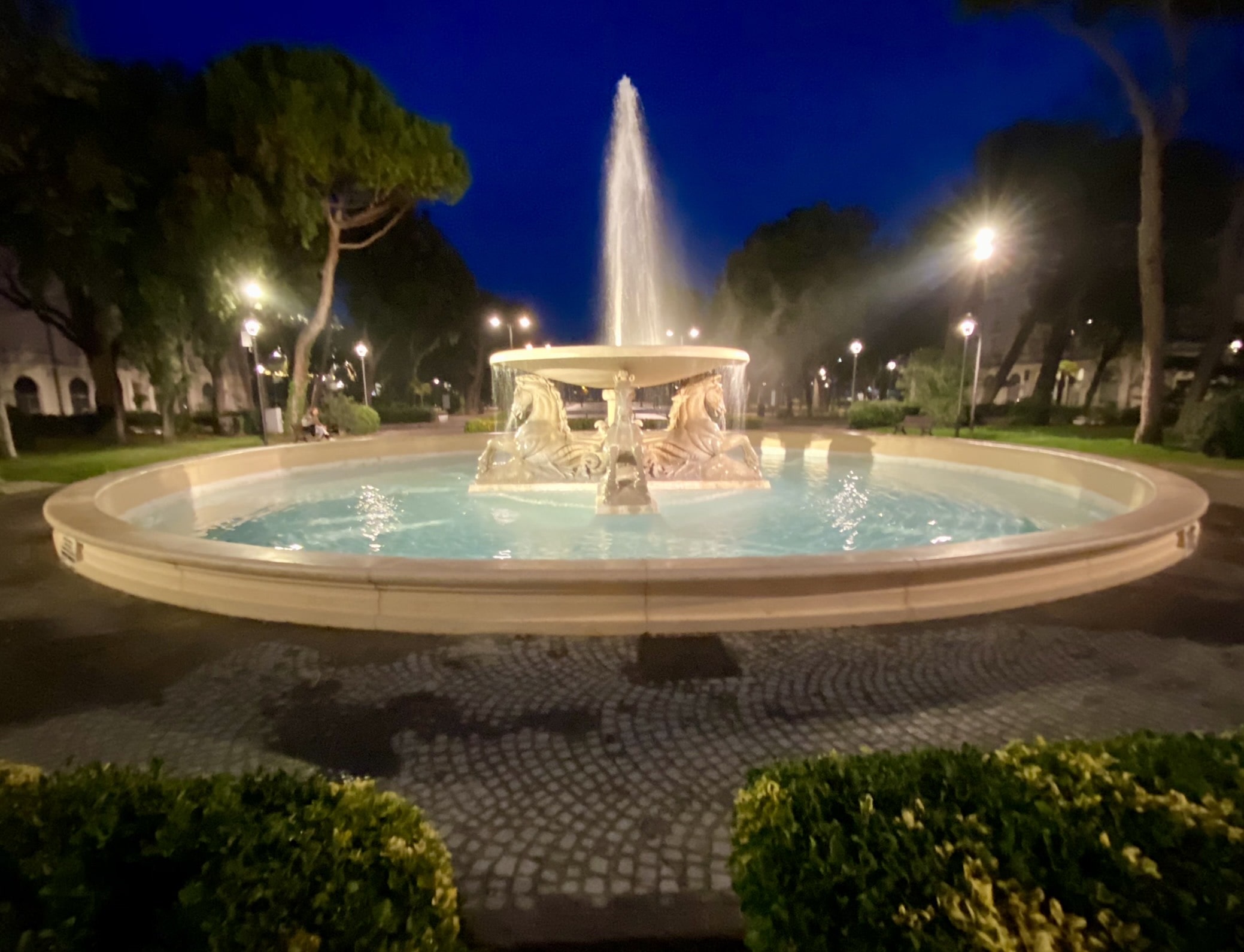 La Fontana dei Quattro Cavalli si trova in Piazzale Fellini in un punto straordinariamente scenografico, che chiude la prospettiva di viale Principe Amedeo verso il mare. Il fruscio delle sue acque e la frescura del parco ne fanno meta privilegiata in tutte le stagioni. È uno dei luoghi più amati per scattare i selfie. Non sono pochi, poi, coloro che vi gettano la monetina come tradizione vuole per le più importanti fontane italiane.